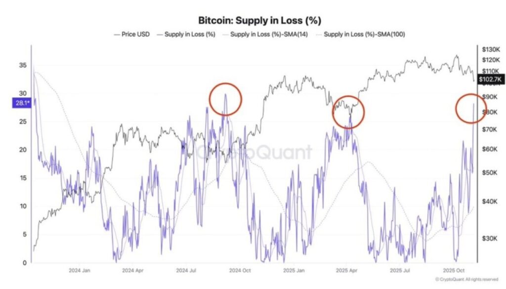 Sumber: CryptoQuantGrafik di atas menunjukkan sekitar 29,2% dari total pasokan Bitcoin yang beredar saat ini disimpan dalam keadaan rugi—angka yang hanya muncul tiga kali dalam satu dekade terakhir.
