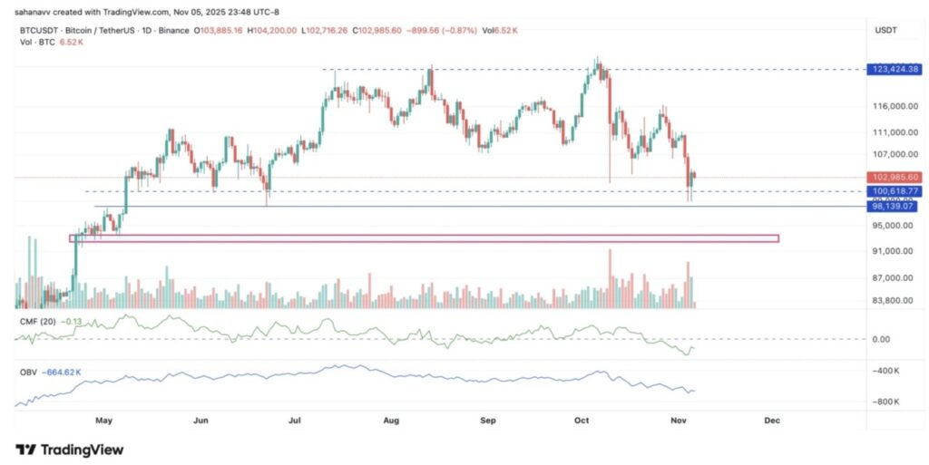 Sejak awal kuartal terakhir, likuiditas tampak mengalir keluar dari Bitcoin, kemungkinan besar menuju altcoin lain. Indikator On-Balance Volume (OBV) terus menurun sejak Oktober, menunjukkan lemahnya arus masuk modal. Tren ini mirip dengan penurunan yang terjadi dari Februari ke Maret lalu, yang menjatuhkan harga dari $106.000 to sekitar $77.000.