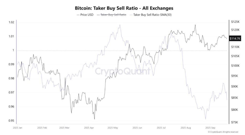 Data dari CryptoQuant menunjukkan bahwa rasio taker buy/sell di seluruh bursa telah turun di bawah angka 1 dalam beberapa minggu terakhir. Pola ini juga diperkuat oleh SMA30 (simple moving average 30 hari) yang mengikuti tren penurunan.