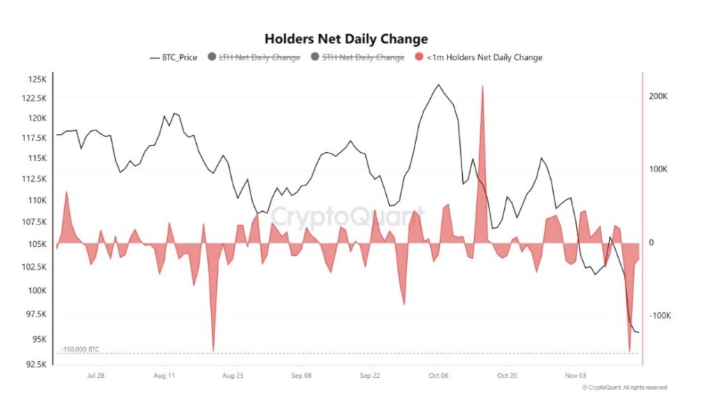 Berdasarkan data dari CryptoQuant, tekanan jual terjadi karena Short-Term Holders (STH) melepas sekitar 148.000 BTC pada harga di bawah Rp1,67 miliar ($100.000), yang menyebabkan harga turun ke sekitar Rp1,6 miliar ($96.000).