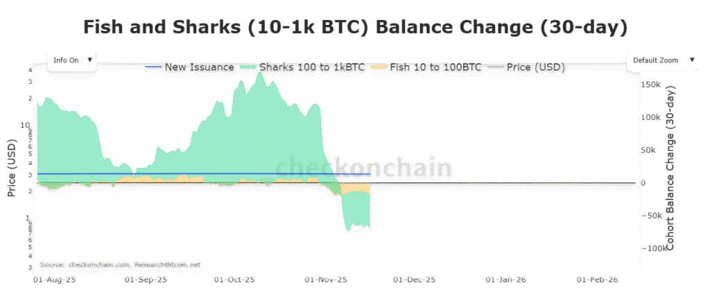 Tak hanya STH, kelompok investor besar menengah seperti shark (pemegang 100–1.000 BTC) juga menunjukkan perilaku distribusi. Checkonchain mencatat bahwa kelompok ini telah mengurangi kepemilikan mereka sebesar 53.700 BTC dalam 30 hari terakhir hingga 16 November.