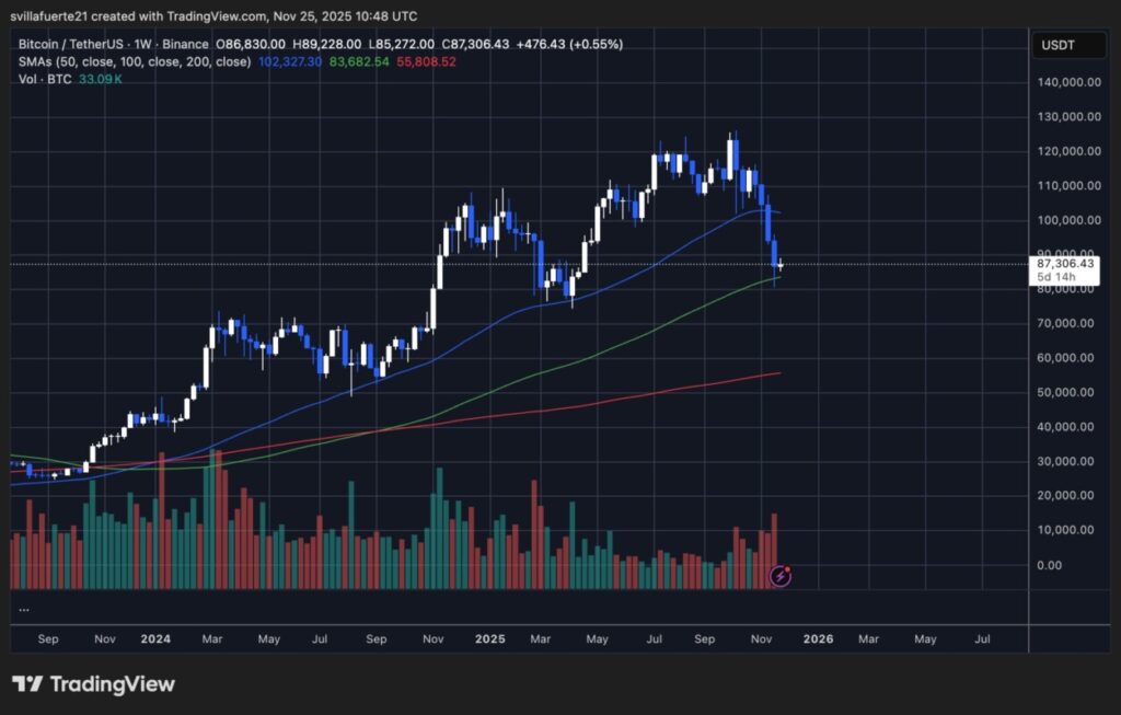 Grafik mingguan Bitcoin menunjukkan pasar yang berusaha stabil setelah penurunan tajam dari rekor tertinggi mendekati $126.000. Harga saat ini diperdagangkan sekitar $87.300, mencerminkan penurunan signifikan lebih dari 30% dari puncaknya. Struktur candle terbaru menyoroti rebound sementara setelah menyentuh titik terendah di dekat $80.000, menunjukkan bahwa pembeli telah masuk di zona dukungan kritis.