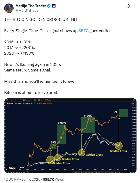 Karena sejarah ini, sinyal terkini ini mendapatkan banyak perhatian. Merlijn, seorang analis pasar, menyoroti pola ini dalam sebuah postingan di X. Ia menggambarkan bagaimana Bitcoin (BTC) “melonjak secara vertikal” setiap kali pola ini muncul. Ia juga membandingkannya dengan golden cross yang terbentuk pada Oktober 2024, ketika Bitcoin (BTC) diperdagangkan di dekat $65.000. Dalam tiga bulan setelah itu, harga Bitcoin (BTC) naik hampir mencapai $110.000.