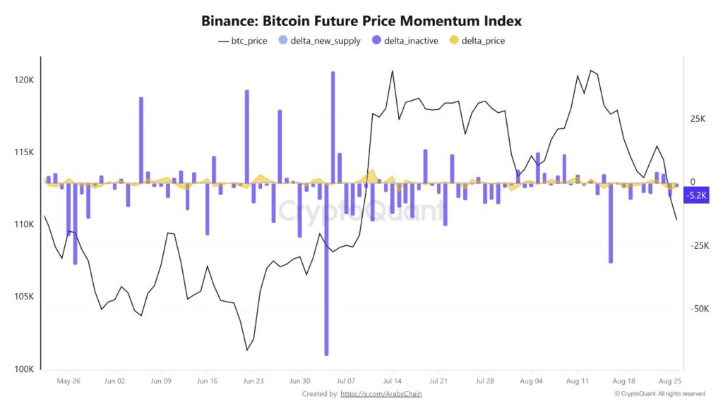 Namun, pertengahan Agustus menandai perubahan tren saat delta yang tidak aktif meningkat, menandakan bahwa koin yang telah lama disimpan mulai dipindahkan dan kemungkinan dijual. Aktivitas ini bertepatan dengan penurunan harga Bitcoin (BTC) di bawah $112.000, dengan indikator Delta yang tetap mendekati nol, menunjukkan tidak adanya tekanan beli yang jelas.