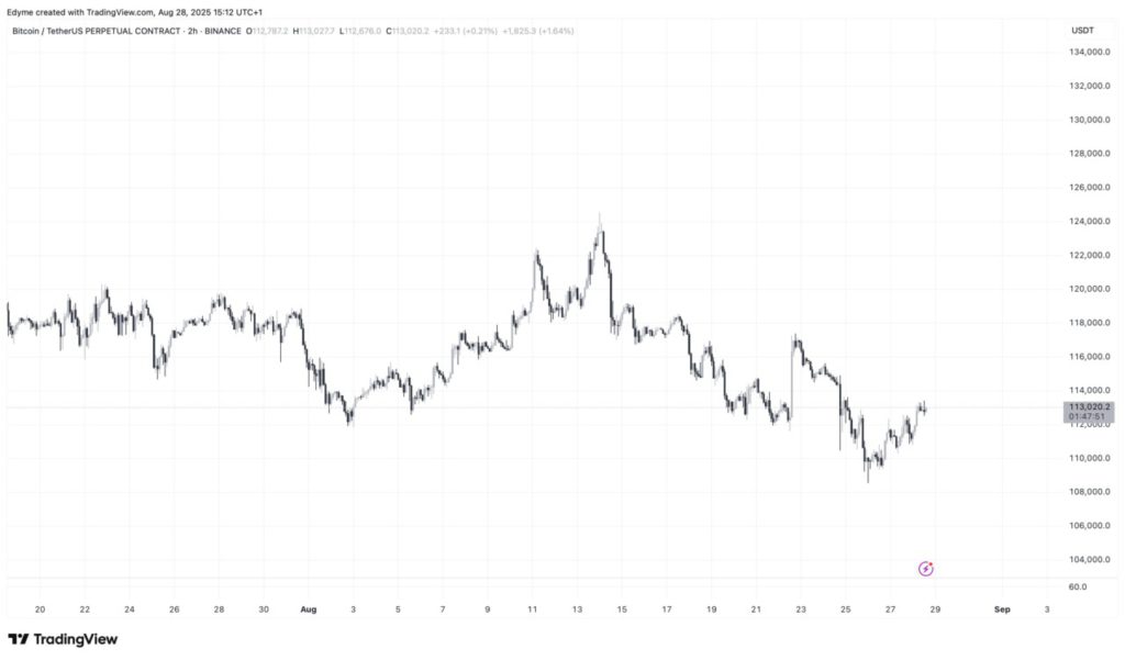 Jakarta, Pintu News – Bitcoin mengalami tekanan harga setelah mundur dari rekor tertinggi di atas $124.000 awal bulan ini. Saat ini, Bitcoin (BTC) diperdagangkan pada $113.146, turun 8,7% dari puncak terbarunya, meskipun mencatat kenaikan harian sebesar 1,8%.
