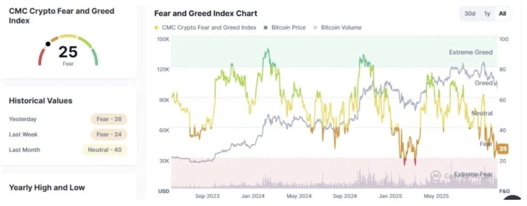 Sumber: CoinMarketCapLikuidasi besar terhadap posisi long ini memicu tekanan long squeeze di tengah meningkatnya kekhawatiran akan kapitulasi lanjutan. Indeks ketakutan dan keserakahan kripto kini turun ke level terendah dalam beberapa bulan, sekitar 25, yang mencerminkan ketakutan ekstrem dari para pelaku pasar.