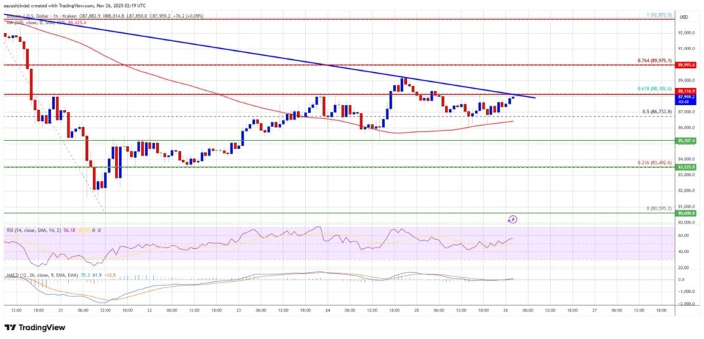 Jakarta, Pintu News – Bitcoin telah memulai gelombang pemulihan dengan menembus di atas $88.000. Saat ini, BTC sedang konsolidasi dan mungkin segera menargetkan kenaikan di atas zona $90.000.