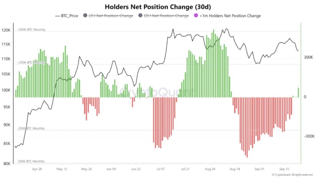 Menurut postingan CryptoQuant Quicktake oleh Crazzyblockk, perubahan posisi bersih dari pemegang Bitcoin (BTC) yang baru memiliki aset digital kurang dari satu bulan telah berubah secara signifikan ke wilayah positif. Hal ini menunjukkan bahwa ada aliran permintaan baru yang masuk ke pasar dengan cepat.