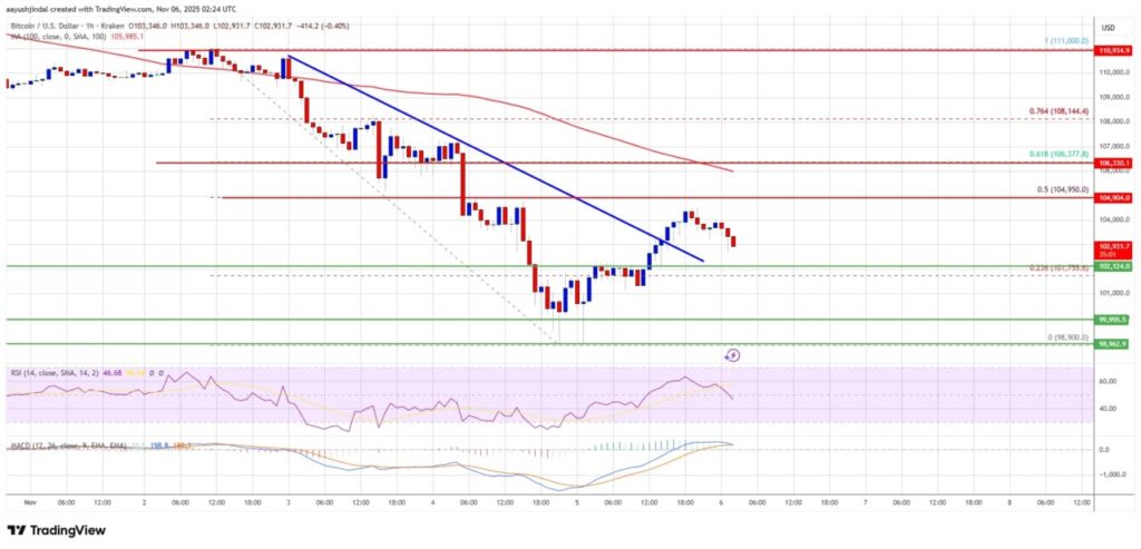 Bitcoin (BTC) mengalami penurunan yang signifikan setelah tidak mampu bertahan di atas level dukungan $105.000. Harga sempat jatuh di bawah $103.500 dan $102.000, menunjukkan bahwa bearish masih mendominasi pasar. Penurunan ini bahkan mencapai di bawah dukungan kritis $100.000, dengan harga terendah tercatat di $98.900 sebelum akhirnya mencoba pemulihan.