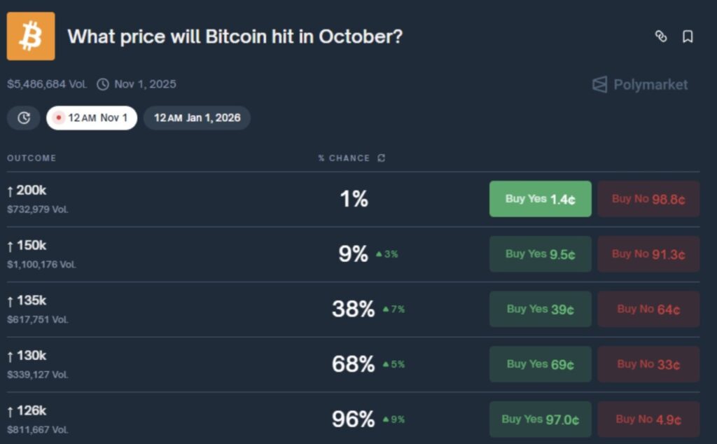 Berdasarkan data dari Polymarket, terdapat peluang sebesar 68% bahwa Bitcoin akan menyentuh $130.000 bulan ini, serta 38% peluang untuk mencapai $135.000, sejalan dengan proyeksi Standard Chartered.