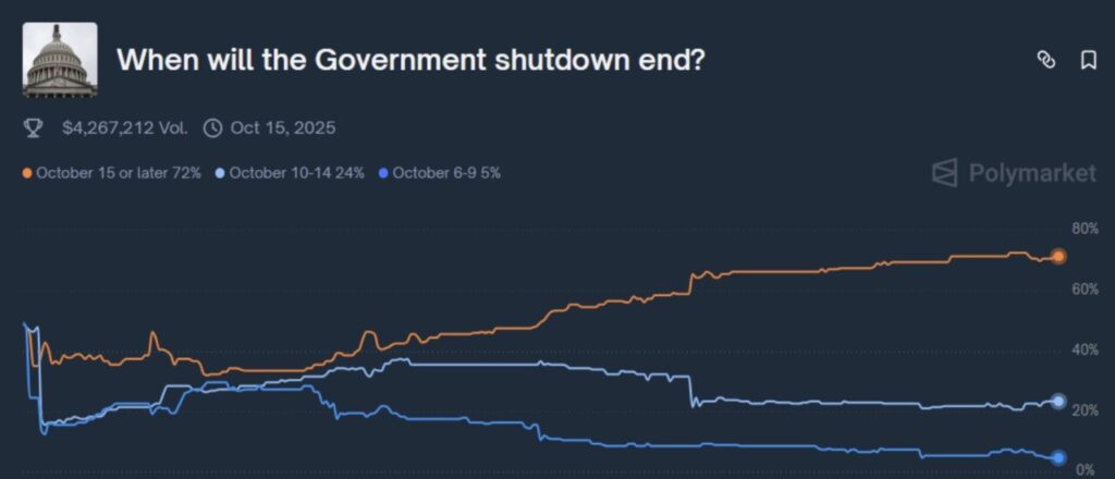 Kenaikan harga Bitcoin ini terjadi di tengah ekspektasi pasar terhadap berlanjutnya penutupan pemerintahan Amerika Serikat (U.S. government shutdown). Berdasarkan data dari Polymarket, terdapat peluang sebesar 72% bahwa penutupan tersebut baru akan berakhir pada atau setelah 15 Oktober.
