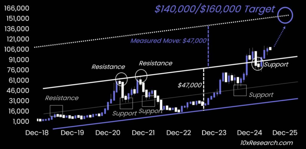 Berdasarkan analisis 10x Research, target harga Bitcoin untuk tahun 2025 berada di kisaran $140.000 hingga $160.000 (Rp2,28 miliar–Rp2,60 miliar). Rachael Lucas dari BTC Markets menyoroti bahwa penembusan harga $120.000 adalah bukti digital asset sudah menjadi bagian portofolio institusi besar.