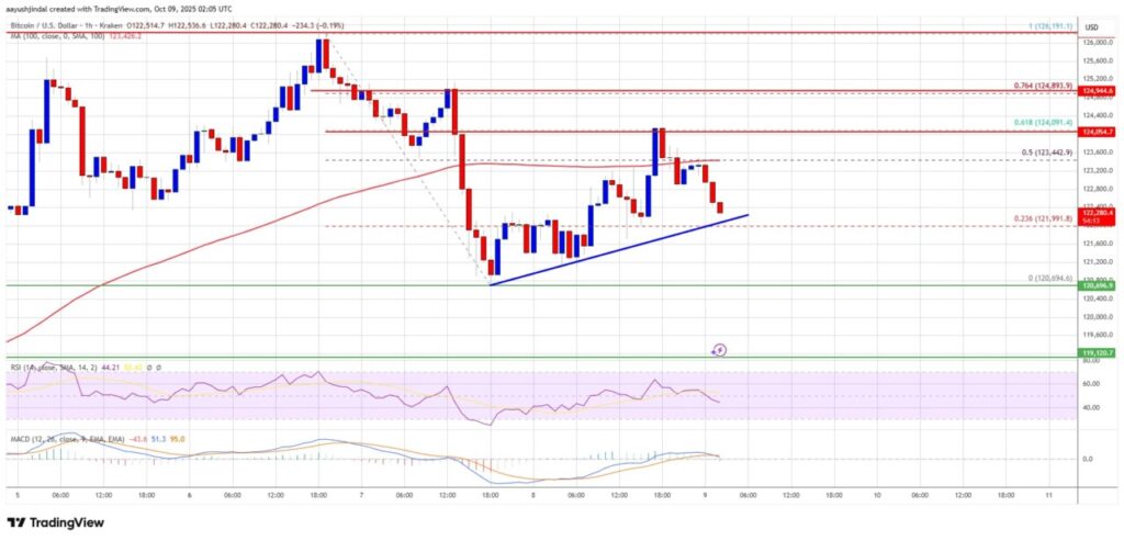 Dalam analisis teknikal, Bitcoin (BTC) kini berada di bawah rata-rata pergerakan sederhana 100 jam, yang menunjukkan adanya tekanan jual. Ada garis tren bullish yang terbentuk dengan dukungan di $122.200 pada grafik per jam pasangan BTC/USD. Namun, resistensi langsung berada di $123.450, dengan resistensi kunci berikutnya di $124.000, yang bertepatan dengan level retracement Fibonacci 61,8%.