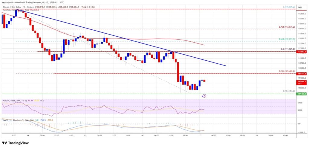Penurunan ini terus berlanjut hingga di bawah $108.000, dengan titik terendah baru terbentuk di $107.483. Saat ini, Bitcoin (BTC) sedang konsolidasi kerugian di bawah level retracement Fibonacci 23,6% dari penurunan terakhir dari $115.975 ke $107.483.