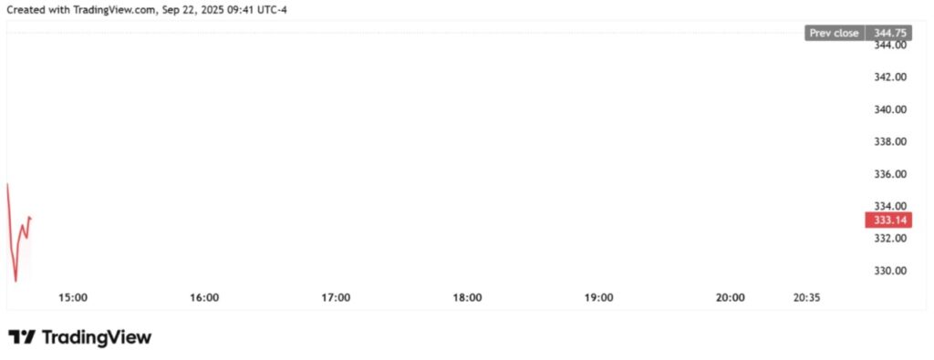 Data dari TradingView menunjukkan bahwa saham MSTR per 22 September sempat diperdagangkan di kisaran $336, turun lebih dari 2% dibandingkan harga penutupan minggu lalu sebesar $344.