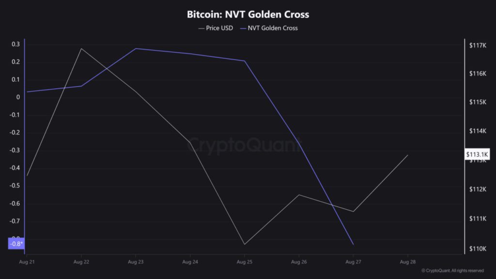 Penting untuk menunjukkan bahwa NVT golden cross, yang membandingkan valuasi Bitcoin (BTC) dengan aktivitas transaksi, telah meluncur ke wilayah oversold. Ini tidak menjamin dasar pasar, tetapi menunjukkan bahwa harga mungkin terlalu rendah relatif terhadap penggunaan jaringan.