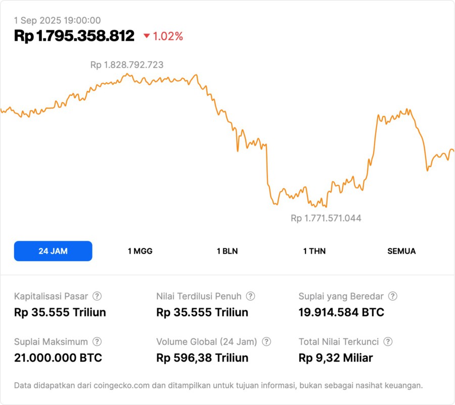 Konten ini bertujuan untuk memperkaya informasi pembaca. Pintu mengumpulkan informasi ini dari berbagai sumber yang relevan dan tidak terpengaruh oleh pihak luar. Sebagai catatan, kinerja masa lalu aset tidak menentukan proyeksi kinerja yang akan datang. Aktivitas jual beli kripto memiliki risiko dan volatilitas yang tinggi, selalu lakukan riset mandiri dan gunakan uang dingin sebelum berinvestasi. Segala aktivitas jual beli Bitcoin dan investasi aset kripto lainnya menjadi tanggung jawab pembaca.