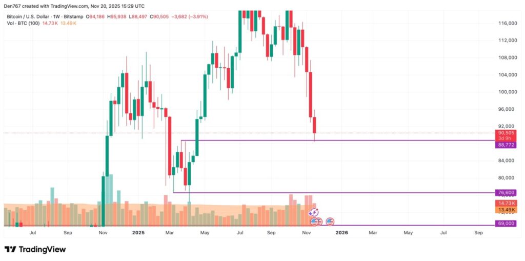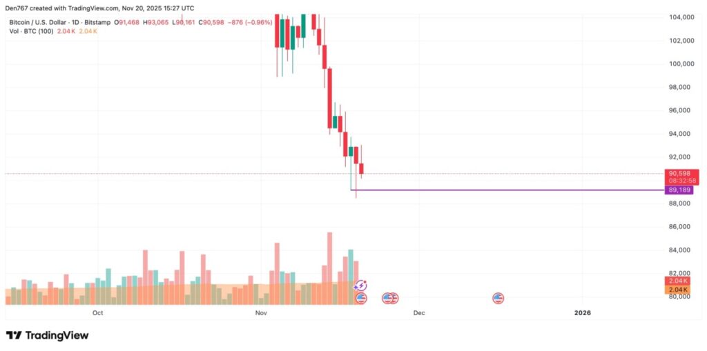 Dalam jangka waktu yang lebih panjang pun, belum terlihat tanda-tanda pembalikan arah. Saat ini, harga sedang menuju ke level dukungan berikutnya di $89.189. Jika level ini ditembus, potensi penurunan lanjutan ke area $86.000–$88.000 semakin terbuka lebar.